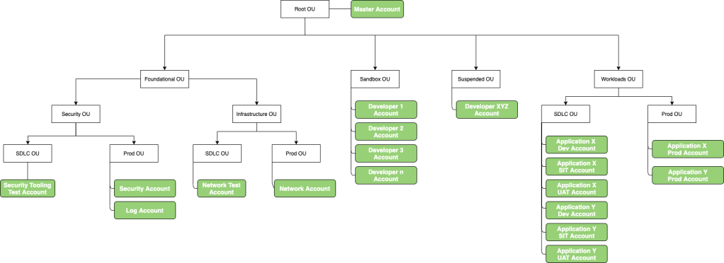 - Workloads OU – this is main OU for your applications. This is where you have Production account for each of the applications you are running in AWS (under Prod OU) as well as set of Dev/SIT/UAT/Test/Pre-Prod/etc. accounts under SDLC OU.